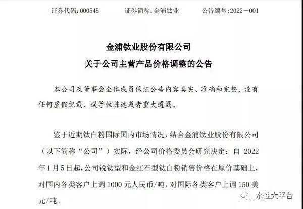 金浦钛业:发布钛白粉调价函通知,称自2022年1月5日起,公司锐钛型和金红石型钛白粉售价在原价基础上,对国内各类客户上调1000元/吨,对国际各类客户上调150美元/吨(955.8人民币)。