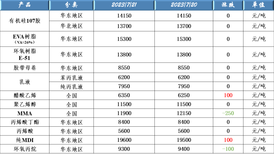 有机硅107、EVA树脂、环氧树脂、胶带母卷、醋酸乙烯、聚乙烯醇、乳液、丙烯酸、MDI及环氧丙烷原料价格走势
