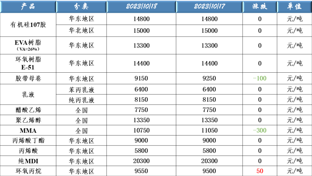 有机硅107、EVA树脂、环氧树脂、胶带母卷、醋酸乙烯、聚乙烯醇、乳液、丙烯酸、MDI及环氧丙烷原料价格走势