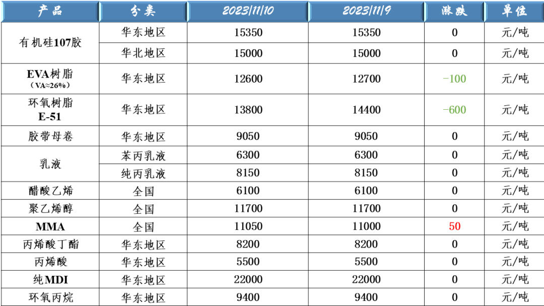 有机硅107、EVA树脂、环氧树脂、胶带母卷、醋酸乙烯、聚乙烯醇、乳液、丙烯酸、MDI及环氧丙烷原料价格走势