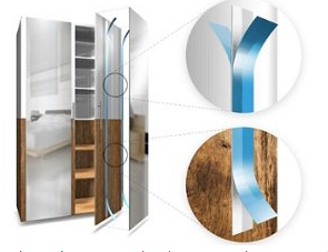 Lohmann’s “Bonding Engineers” have developed a new mirror bonding tape (DuploCOLL® 91800) for the furniture industry and decorative foil producers. The double sided adhesive with a tailor-made acrylate coated PE foam tape is especially suitable for the mounting and permanent bonding on high gloss, anti-fingerprint, 3D and rough surfaces. With DuploCOLL® 91800 Lohmann’s “Bonding Engineers” have once again proven their good instinct for future trends. Especially in the furniture industry decorative surfaces have become more and more important. These surfaces are challenging though for standard adhesive tapes. Lohmann’s solution is its own development of an asymmetric construction with a tailor-made adhesive on the open side, fitting the decorative film market trend.