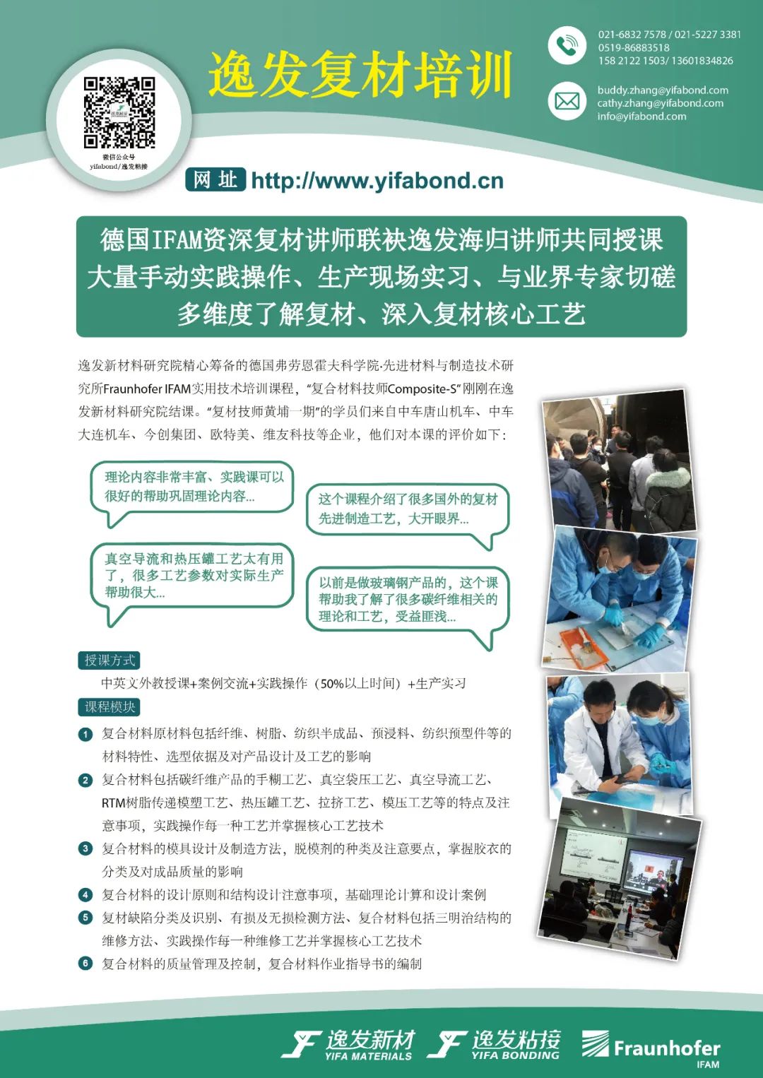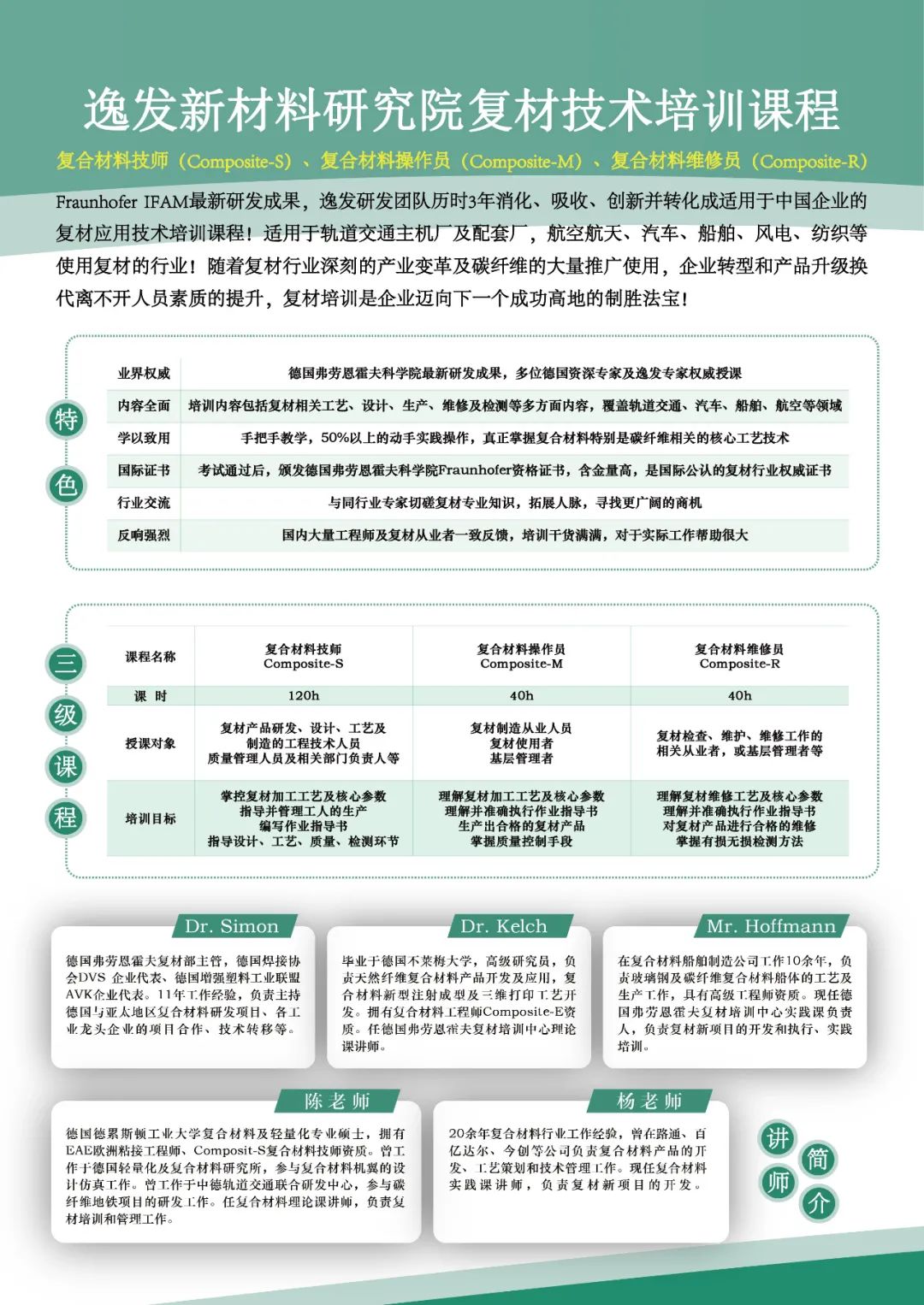逸发新材料研究院精心筹备的德国Fraunhofer IFAM(弗劳恩霍夫科学院·先进材料与制造技术研究所)实用技术培训课程,“复合材料技师Composite-S” 刚刚在逸发新材料研究院结课。该系列课程是Fraunhofer IFAM的最新研发成果,逸发研发团队历时3年消化、吸收、创新并转化成适用于中国企业的复材应用技术培训课程!适用于轨道交通主机厂及配套厂,航空航天、汽车、船舶、风电、纺织等使用复材的行业!随着复材行业深刻的产业变革及碳纤维的大量推广使用,企业转型和产品升级换代离不开人员素质的提升,复材培训是企业迈向下一个成功高地的制胜法宝!
