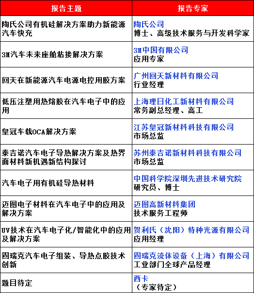 以上两会将重点邀请上汽、吉利、蔚来、比亚迪、华为、歌尔股份、欧菲光、比亚迪、小米、VIVO、oppo、TCL、华星、海康微视、舜宇、京东方、天马微电子、美的、创维、松下、长虹、海信、康佳、TCL、联想、华勤集团、传音控股、维信诺、惠科、和辉光电、华佳彩、龙腾光电、彩虹光电等单位等电子等终端知名用胶企业代表参会。本次论坛,对下游电子用胶终端厂家代表参会实行特殊优惠政策及绿色通道。欢迎一直从事汽车电子用胶及点胶、电子胶粘材料等经营和研究的企业和单位主动联系做报告发言,本次两大论坛设若干家赞助发言席位!会议赞助及报告发言联系方式:13667189191(同微信)。