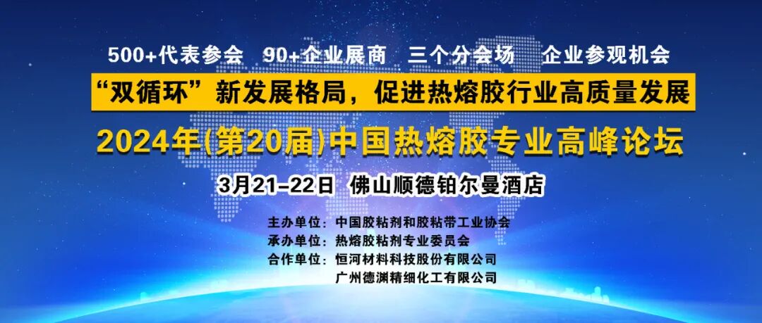 由中国胶粘剂和胶粘带工业协会与热熔胶粘剂专业委员会共同主办的2024年(第20届)中国热熔胶专业高峰论坛将于3月20-22日在广东省佛山市召开。作为行业高端品牌会议,热熔胶高峰论坛一如既往受到了国内外热熔胶和热熔压敏胶生产企业、加工应用单位、原材料供应商、科研院所及相关单位的持续关注,获得了众多参会代表的高度评价和赞誉。今年的热熔胶高峰论坛有哪些精彩内容和亮点呢?提前带您领略一下!