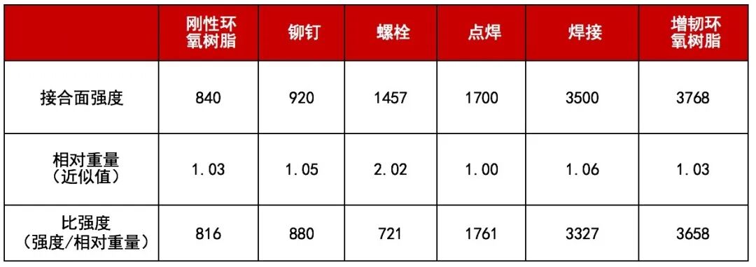 对粘接接合面特定强度的进一步对比显示,胶粘剂在强度和缩减重量方面都颇具优势。