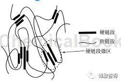 低聚物多元醇构成了玻璃化温度较低的软链段,二异氰酸酯和小分子扩链剂构成了玻璃化温度较高的硬链段,软、硬链段互嵌而形成聚氨酯大分子如图所示。