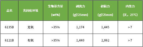 因应国际间的减碳趋势,长兴推出生物基UV光固化压敏胶系列,根据客户生产制程,提供UV-无氧固化树脂6135B及UV-有氧固化树脂6121B。此系列产品具有高初黏力和剥离力、低收缩特性及优异的内聚力,可移除性佳,且因生物基原料的引入,使被黏物件的回收更加容易,有助于胶带产业的可持续发展性。系列产品可依据不同的黏着力需求,广泛适用于一般透明胶带、PET双面胶带、文具胶带、民生家居饰板贴合、背光模块组装贴合及电子零组件粘接贴合等应用。